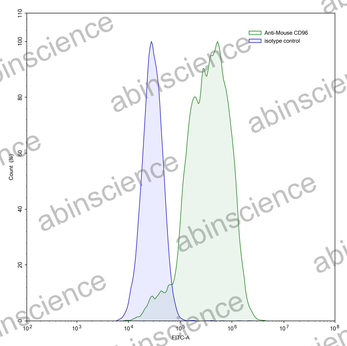 Flow-cytometry using anti-mouse CD96 antibody.CD96 Transfected CHO cells were stained with an irrelevant antibody (Blue Histogram) or an anti-mouse CD96 antibody monoclonal antibody (Catalog # MW832107 ,Green Histogram) at a concentration of 5 µg/ml for 30 mins at RT. After washing, bound antibody was detected using a FITC conjugated goat anti-mouse antibody (Catalog # MF690414) and cells analysed on a NovoCyte Flow Cytometer. |