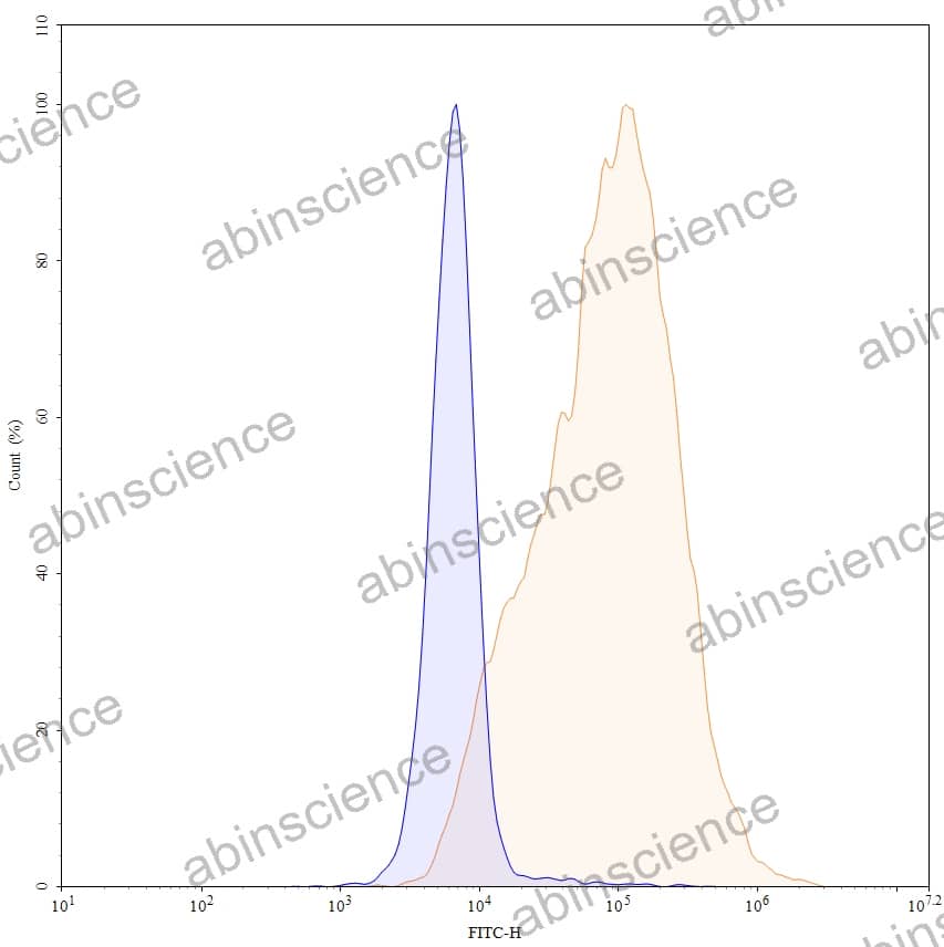 Flow-cytometry using anti-human CD274 antibody. Untransfected cells (blue Histogram) and Transfected cells (Yellow Histogram) were stained with an anti-human CD274 monoclonal antibody (Catalog: MV974207) at a concentration of 5 µg/ml for 30 mins at RT. After washing, bound antibody was detected using a Goat Anti-Mouse IgG H&L Polyclonal Antibody, FITC (abinScience: MF690414) and cells analysed on a NovoCyte Flow Cytometer. |