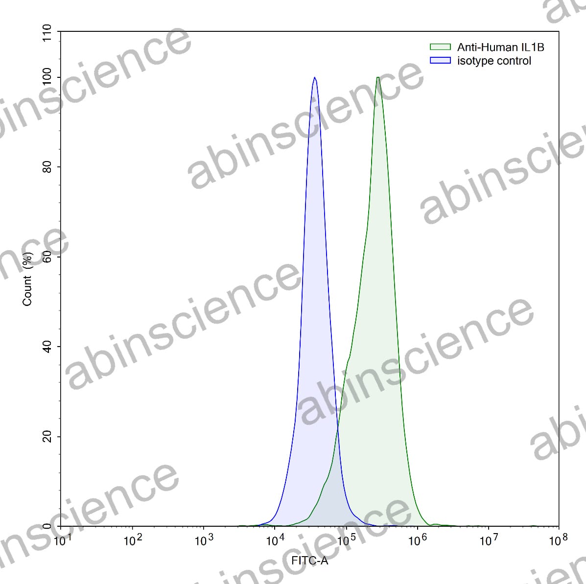 Flow-cytometry using anti-human IL1B antibody.LPS treated THP-1 cells were stained with an irrelevant antibody (Blue Histogram) or an anti-human IL1B antibody monoclonal antibody (Catalog # HF943107 ,Green Histogram) at a concentration of 5 ug/ml for 30 mins at RT. After washing, bound antibody was detected using a FITC conjugated goat anti-mouse antibody (Catalog # MF690414) and cells analysed on a NovoCyte Flow Cytometer. |