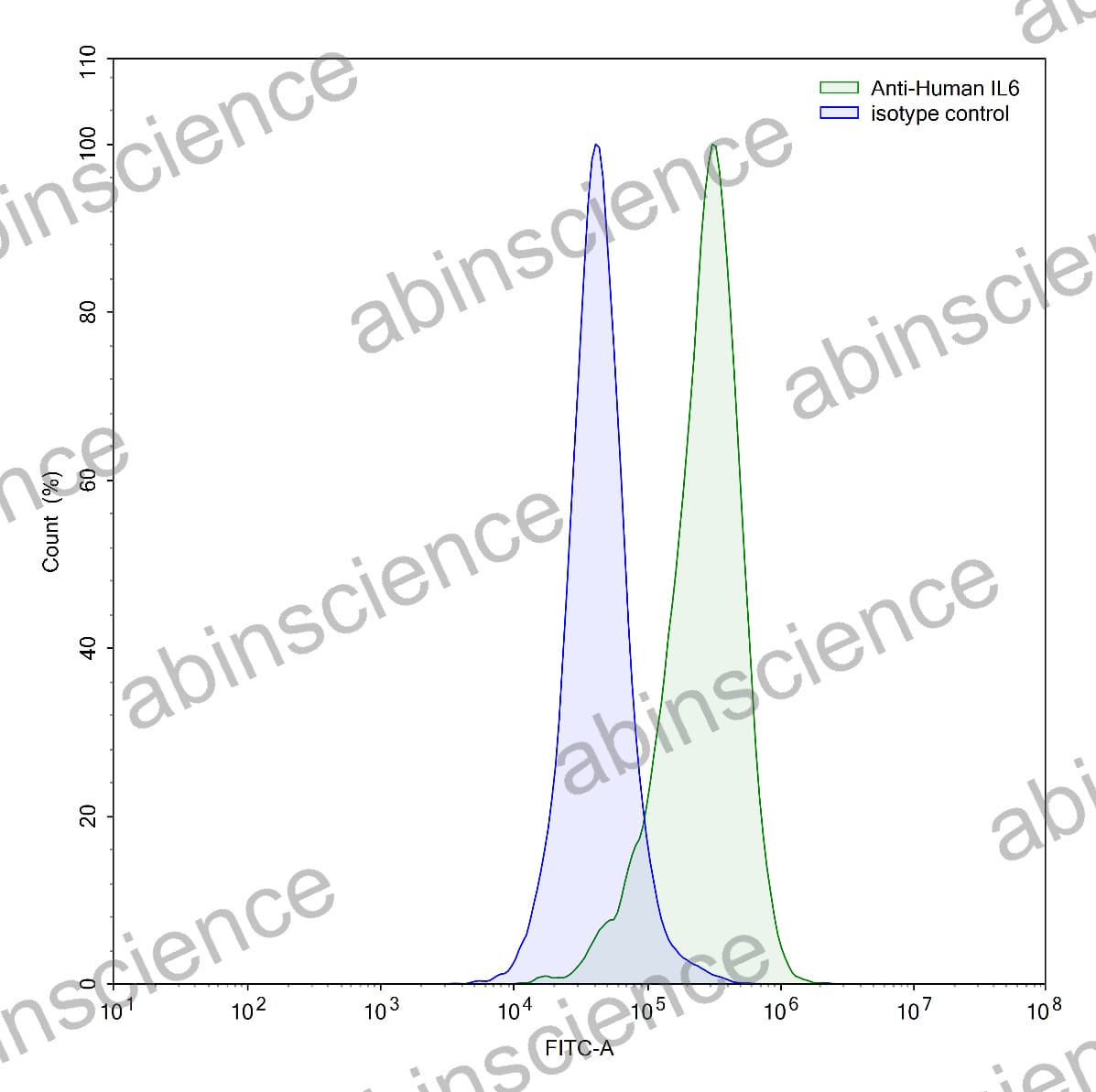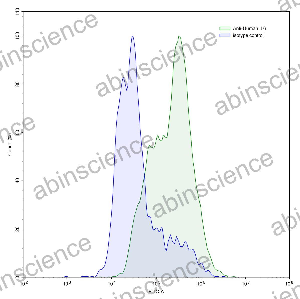 Flow-cytometry using anti-human IL6 antibody.LPS treated THP-1 cells were stained with an irrelevant antibody (Blue Histogram) or an anti-human IL6 antibody monoclonal antibody (Catalog # HY328107 ,Green Histogram) at a concentration of 5 ug/ml for 30 mins at RT. After washing, bound antibody was detected using a FITC conjugated goat anti-mouse antibody (Catalog # MF690414) and cells analysed on a NovoCyte Flow Cytometer. |