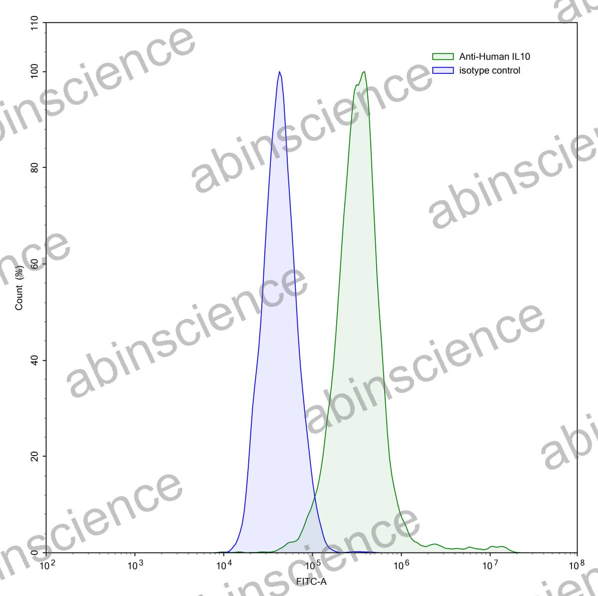 Flow-cytometry using anti-human IL10 antibody.IL10 Transfected CHO cells were stained with an irrelevant antibody (Blue Histogram) or an anti-human IL10 antibody monoclonal antibody (Catalog # HB997107 ,Green Histogram) at a concentration of 5 µg/ml for 30 mins at RT. After washing, bound antibody was detected using a FITC conjugated goat anti-mouse antibody (Catalog # MF690414) and cells analysed on a NovoCyte Flow Cytometer. |