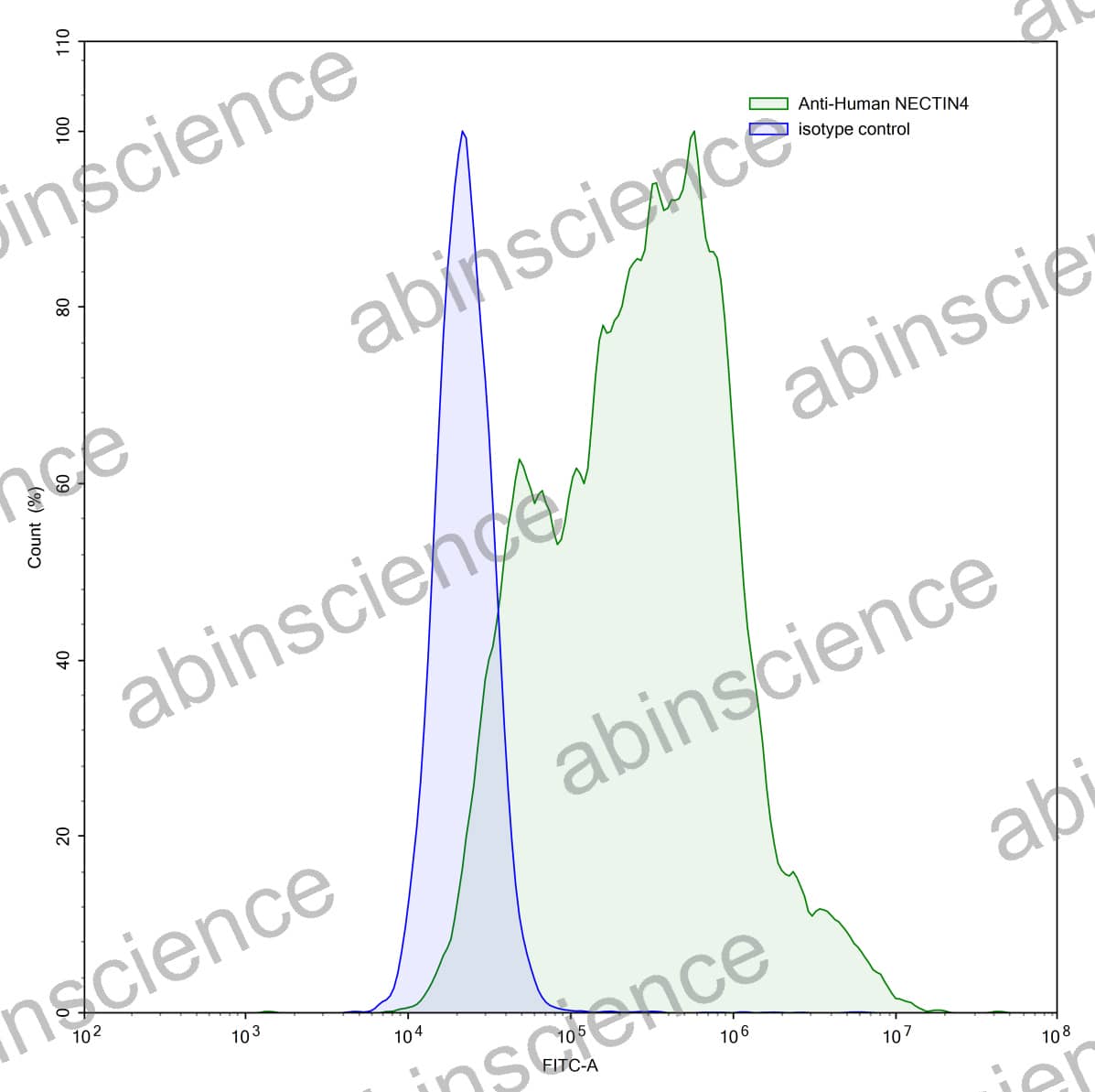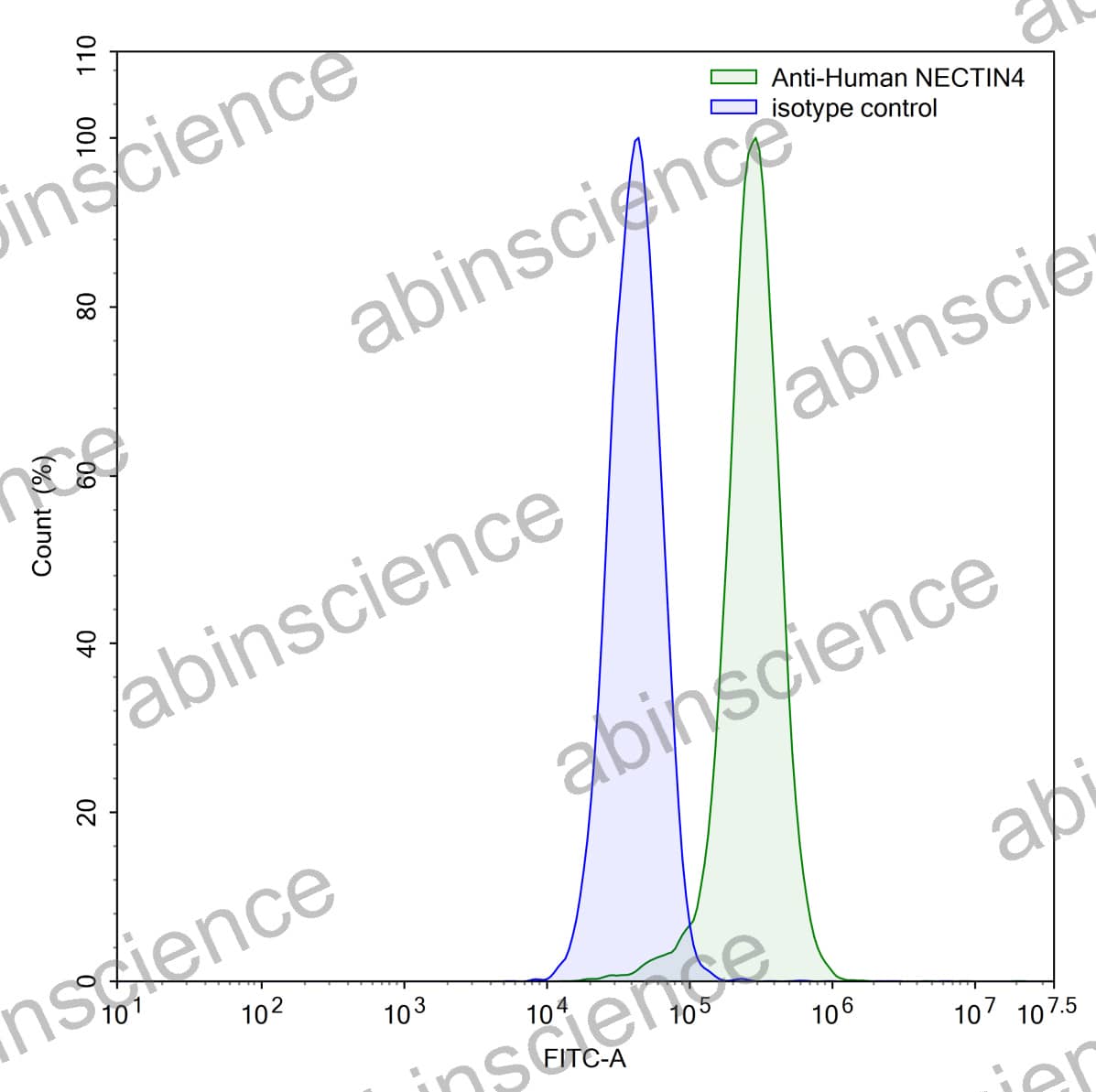 Flow-cytometry using anti-human NECTIN4 antibody.MCF7 cells were stained with an irrelevant antibody (Blue Histogram) or an anti-human NECTIN4 antibody monoclonal antibody (Catalog # HV985107 ,Green Histogram) at a concentration of 5 µg/ml for 30 mins at RT. After washing, bound antibody was detected using a FITC conjugated goat anti-human antibody (Catalog # HF690414) and cells analysed on a NovoCyte Flow Cytometer. |