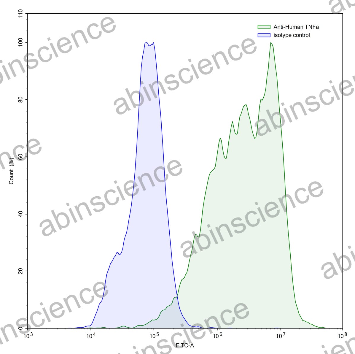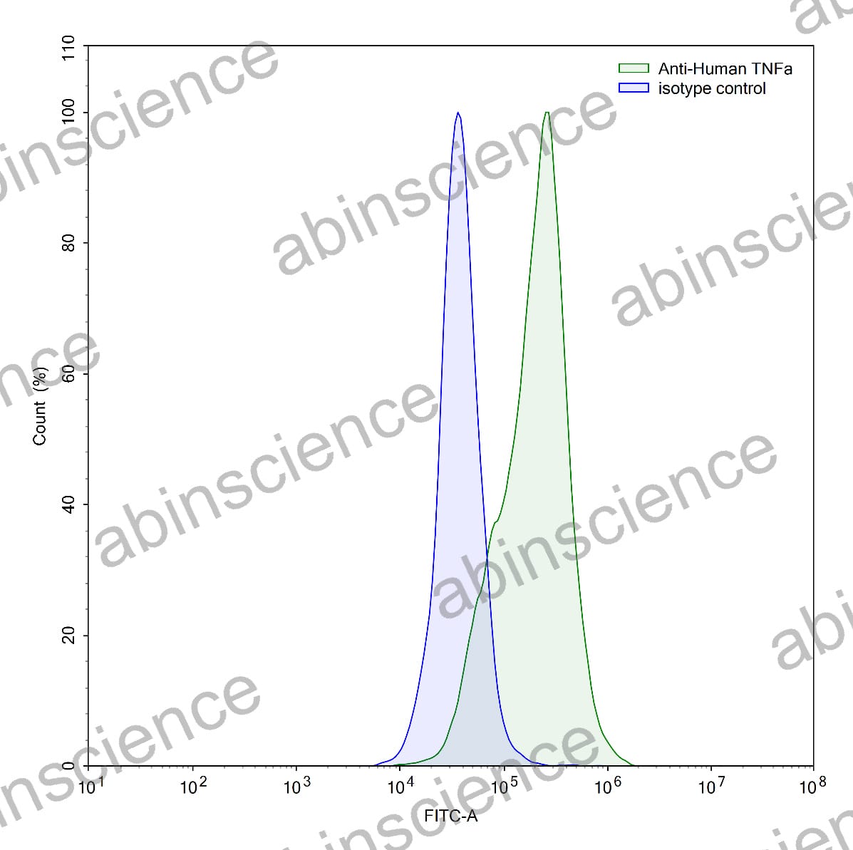 Flow-cytometry using anti-human TNFa antibody.LPS treated THP-1 cells were stained with an irrelevant antibody (Blue Histogram) or an anti-human TNFa antibody monoclonal antibody (Catalog # HF879107 ,Green Histogram) at a concentration of 5 ug/ml for 30 mins at RT. After washing, bound antibody was detected using a FITC conjugated goat anti-mouse antibody (Catalog # MF690414) and cells analysed on a NovoCyte Flow Cytometer. |