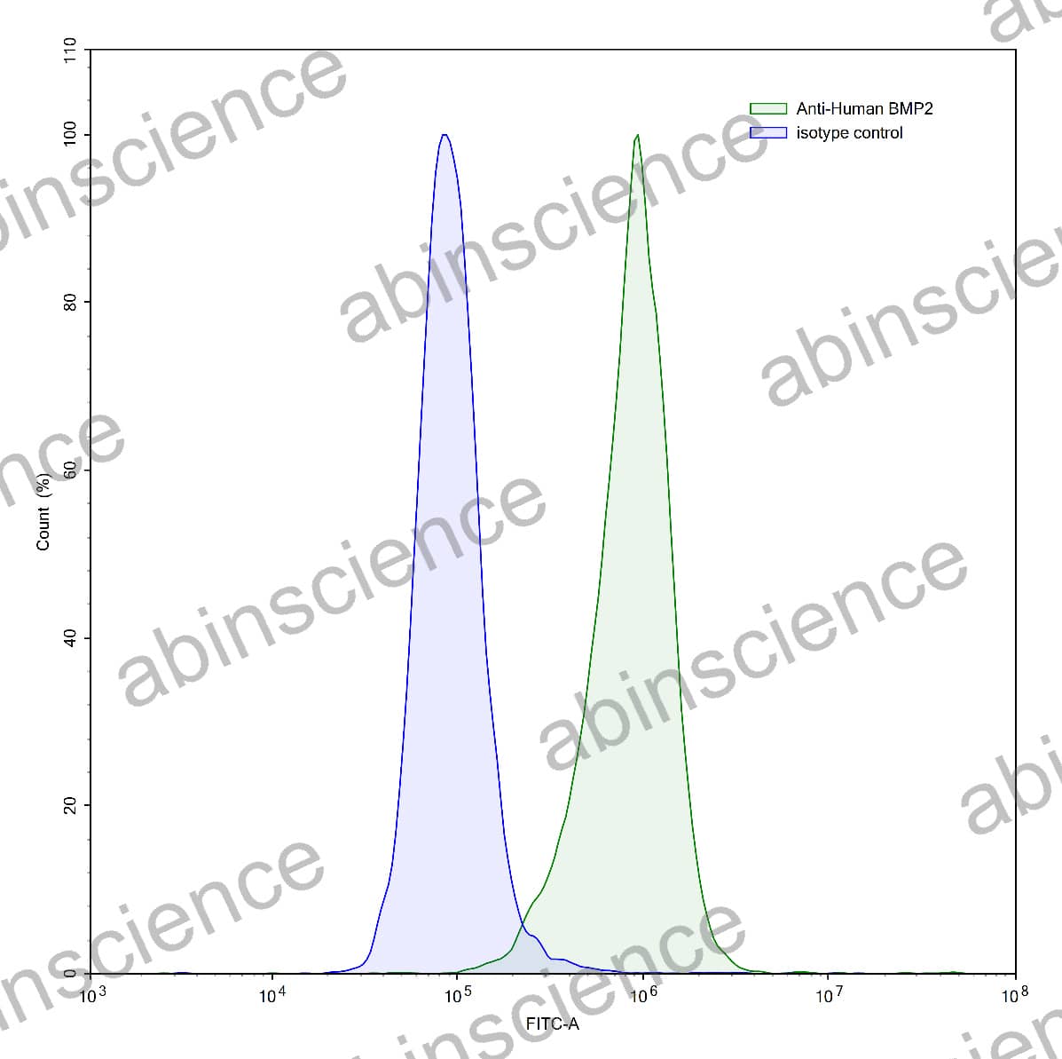 Flow-cytometry using anti-human BMP2 antibody.HeLa cells were stained with an irrelevant antibody (Blue Histogram) or an anti-human BMP2 antibody monoclonal antibody (Catalog # HY576107 ,Green Histogram) at a concentration of 5 µg/ml for 30 mins at RT. After washing, bound antibody was detected using a FITC conjugated goat anti-mouse antibody (Catalog # MF690414) and cells analysed on a NovoCyte Flow Cytometer. |