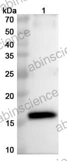 Western blot analysis was performed using anti-E7 protein polyclonal antibody at 1ug/mL on various samples. Lane 1: recombinant HPV18 E7 (Catalog No: VK556062)