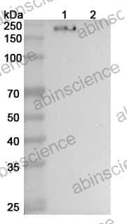 Western blot analysis was performed using anti-CD206/MRC1 monoclonal antibody at 1ug/mL on various samples. Lane 1: recombinant human CD206/MRC1 (Catalog No: HB976011) Lane 2: negative control