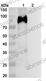 Western blot analysis was performed using anti-/ monoclonal antibody at 1ug/mL on various samples. Lane 1: recombinant HCMV/HHV5 Envelope glycoprotein B/gB(Catalog No: VK665011) Lane 2: negative control Lane 3: negative control