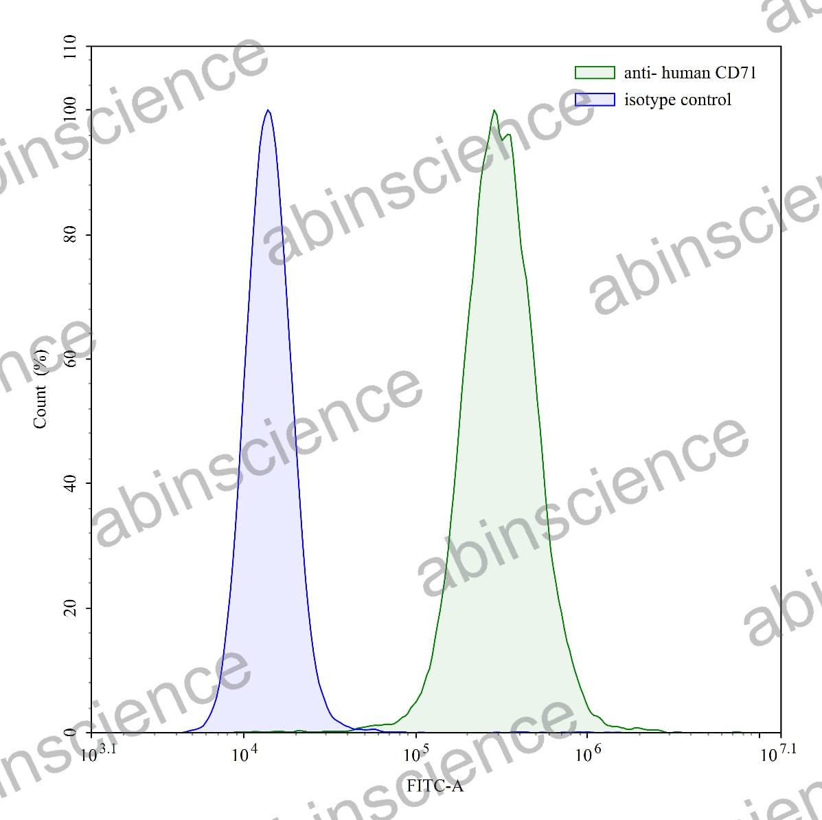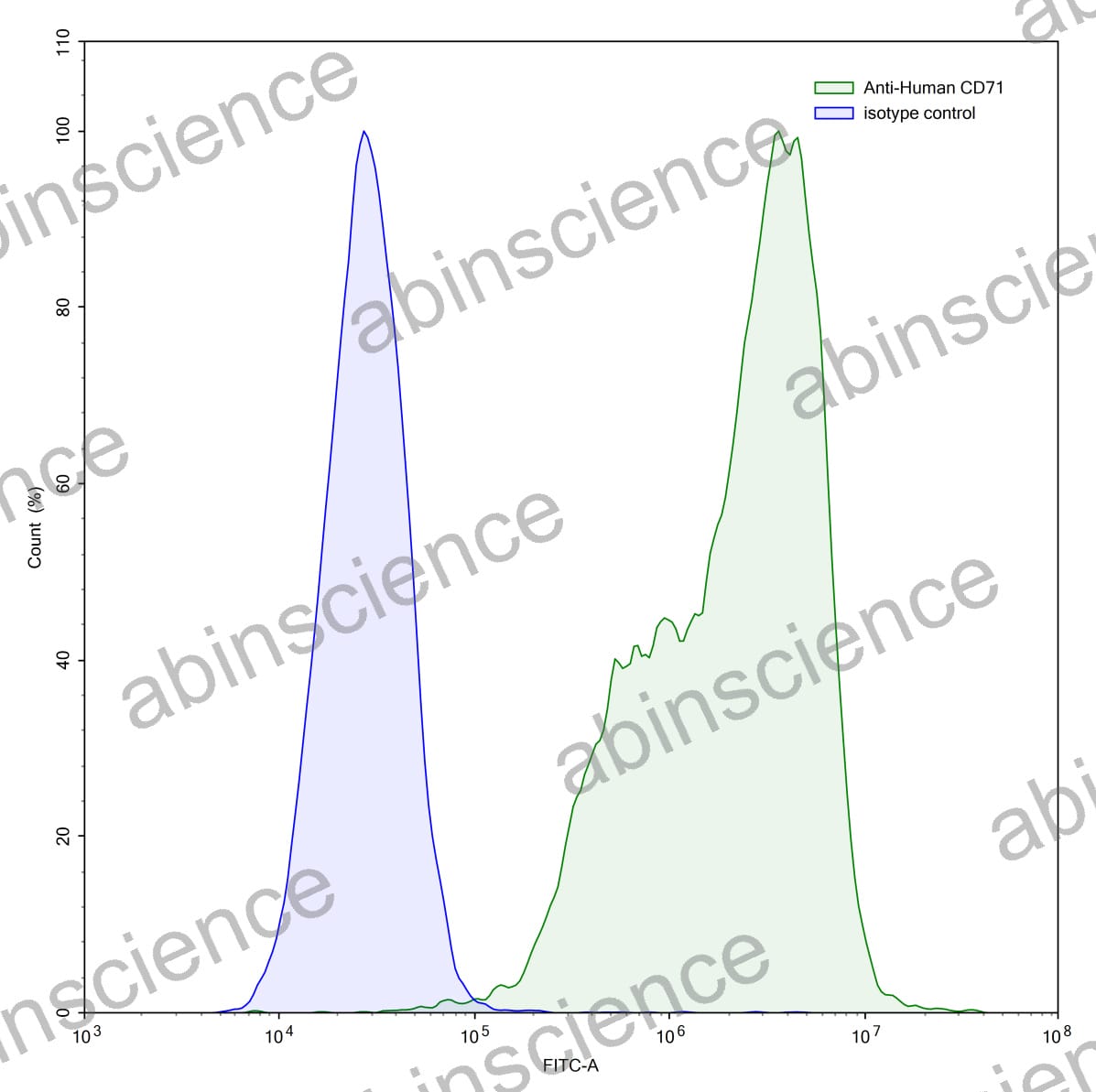 Flow-cytometry using anti-human CD71 antibody.U937 cells were stained with an irrelevant antibody (Blue Histogram) or an anti-human CD71 antibody monoclonal antibody (Catalog # HY036207 ,Green Histogram) at a concentration of 5 ug/ml for 30 mins at RT. After washing, bound antibody was detected using a FITC conjugated goat anti-mouse antibody (Catalog # MF690414) and cells analysed on a NovoCyte Flow Cytometer. |