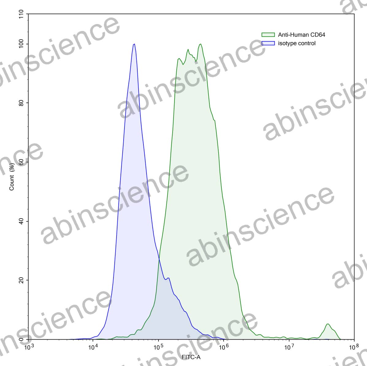 Flow-cytometry using anti-human CD64 antibody.CD64 Transfected CHO cells were stained with an irrelevant antibody (Blue Histogram) or an anti-human CD64 antibody monoclonal antibody (Catalog # HY372207 ,Green Histogram) at a concentration of 5 µg/ml for 30 mins at RT. After washing, bound antibody was detected using a FITC conjugated goat anti-human antibody (Catalog # HF690414) and cells analysed on a NovoCyte Flow Cytometer. |