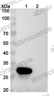 Western blot analysis was performed using anti-PMEL monoclonal antibody at 1ug/mL on various samples. Lane 1: recombinant human PMEL (Catalog No: HW380012) Lane 2: negative control