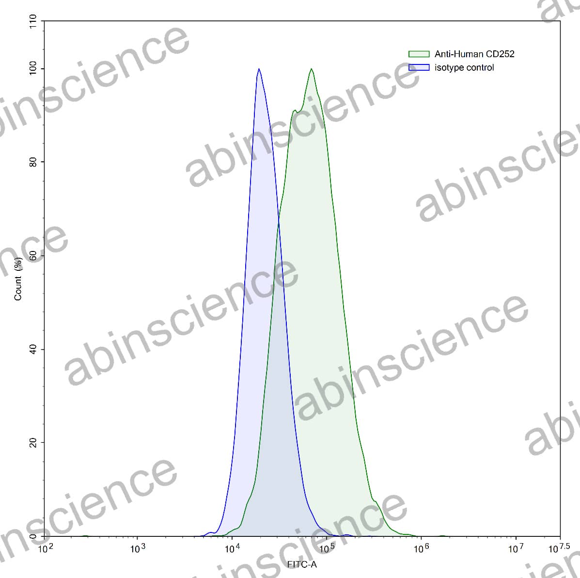 Flow-cytometry using anti-human CD252 antibody.HUVEC cells were stained with an irrelevant antibody (Blue Histogram) or an anti-human CD252 antibody monoclonal antibody (Catalog # HB937307 ,Green Histogram) at a concentration of 5 µg/ml for 30 mins at RT. After washing, bound antibody was detected using a FITC conjugated goat anti-mouse antibody (Catalog # MF690414) and cells analysed on a NovoCyte Flow Cytometer. |