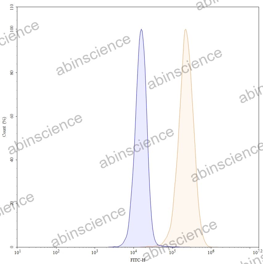 Flow-cytometry using FITC anti-human EGFR antibody. A431 cells were stained with an irrelevant antibody (Blue Histogram) or an FITC anti-human EGFR monoclonal antibody (Catalog: HF004317, Yellow Histogram) at a concentration of 5 µg/ml for 30 mins at RT. After washing, and cells analysed on a NovoCyte Flow Cytometer. |
