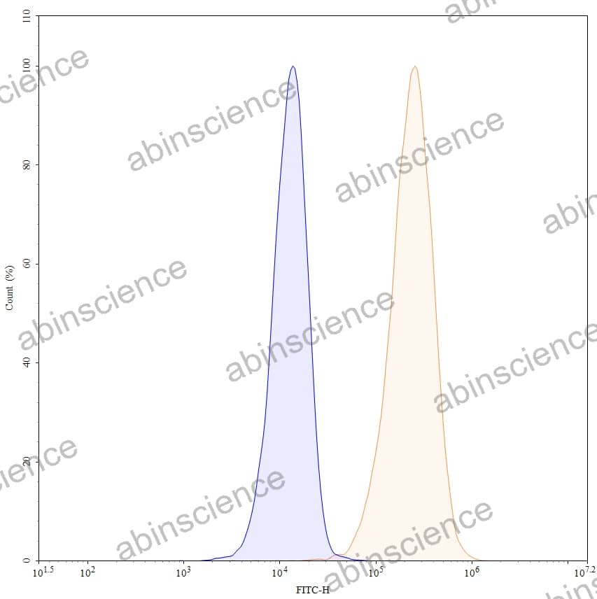 Flow-cytometry using FITC anti-human CD54 antibody. RPMI-8226 cells were stained with an irrelevant antibody (Blue Histogram) or an FITC anti-human CD54 monoclonal antibody (Catalog: HY321217, Yellow Histogram) at a concentration of 5 µg/ml for 30 mins at RT. After washing, cells analysed on a NovoCyte Flow Cytometer. |