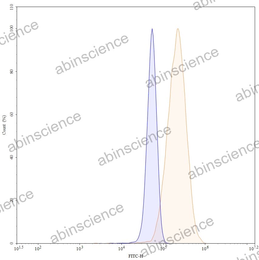 Flow-cytometry using FITC anti-human CSF1 antibody. MG-63 cells were fixed and permeabilized, then stained with an irrelevant antibody (Blue Histogram) or an FITC anti-human CSF1 monoclonal antibody (Catalog: HY515117, Yellow Histogram) at a concentration of 5 µg/ml for 30 mins at RT. After washing, cells analysed on a NovoCyte Flow Cytometer. |