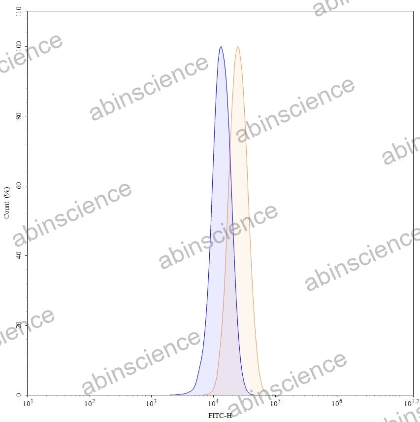 Flow-cytometry using FITC anti-human CD222 antibody. HepG-2 cells were fixed and permeabilized, then stained with an irrelevant antibody (Blue Histogram) or an FITC anti-human CD222 monoclonal antibody (Catalog: HY282117, Yellow Histogram) at a concentration of 5 µg/ml for 30 mins at RT. After washing, cells analysed on a NovoCyte Flow Cytometer. |