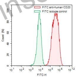 Flow-cytometry using FITC anti-human CD20 antibody. Daudi cells were stained with an irrelevant antibody (Green Histogram) or a FITC anti-human CD20 antibody monoclonal antibody (Catalog # HY257117, Red Histogram) at a concentration of 5 µg/ml for 30 mins at RT. After washing, cells analysed on a NovoCyte Flow Cytometer. |