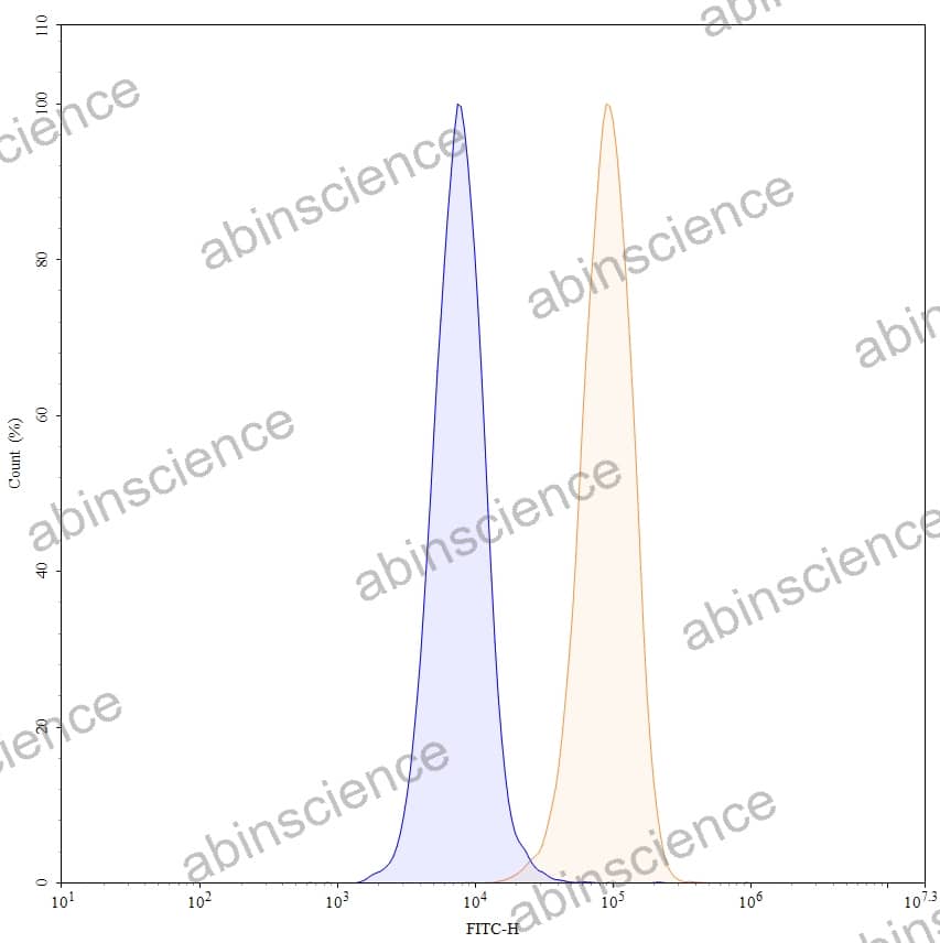 Flow-cytometry using FITC anti-human CD326 antibody. HT-29 cells were stained with an irrelevant antibody (Blue Histogram) or an FITC anti-human CD326 monoclonal antibody (Catalog: HB104217, Yellow Histogram) at a concentration of 5 µg/ml for 30 mins at RT. After washing, cells analysed on a NovoCyte Flow Cytometer. |