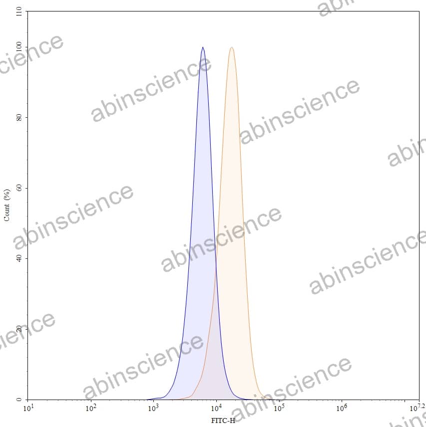 Flow-cytometry using FITC anti-human CD182 antibody. THP-1 cells were stained with an irrelevant antibody (Blue Histogram) or an FITC anti-human CD182 monoclonal antibody (Catalog: HB243117, Yellow Histogram) at a concentration of 5 µg/ml for 30 mins at RT. After washing, and cells analysed on a NovoCyte Flow Cytometer. |