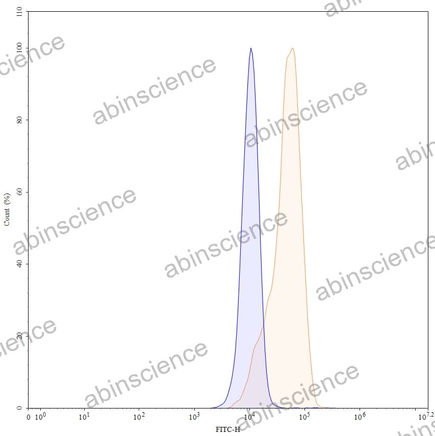 Flow-cytometry using FITC anti-human CD49c antibody. Hela cells were stained with an irrelevant antibody (Blue Histogram) or an FITC anti-human CD49c monoclonal antibody (Catalog: HB114117, Yellow Histogram) at a concentration of 5 µg/ml for 30 mins at RT. After washing, and cells analysed on a NovoCyte Flow Cytometer. |