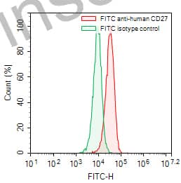 Flow-cytometry using FITC anti-human CD27 antibody. Raji cells were stained with an irrelevant antibody (Green Histogram) or a FITC anti-human CD27 antibody monoclonal antibody (Catalog # HB796217, Red Histogram) at a concentration of 5 µg/ml for 30 mins at RT. After washing, cells analysed on a NovoCyte Flow Cytometer. |