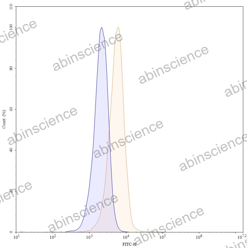 Flow-cytometry using FITC anti-human CD30 antibody. Jurkat cells were stained with an irrelevant antibody (Blue Histogram) or an FITC anti-human CD30 monoclonal antibody (Catalog: HB038317, Yellow Histogram) at a concentration of 5 µg/ml for 30 mins at RT. After washing, cells analysed on a NovoCyte Flow Cytometer. |