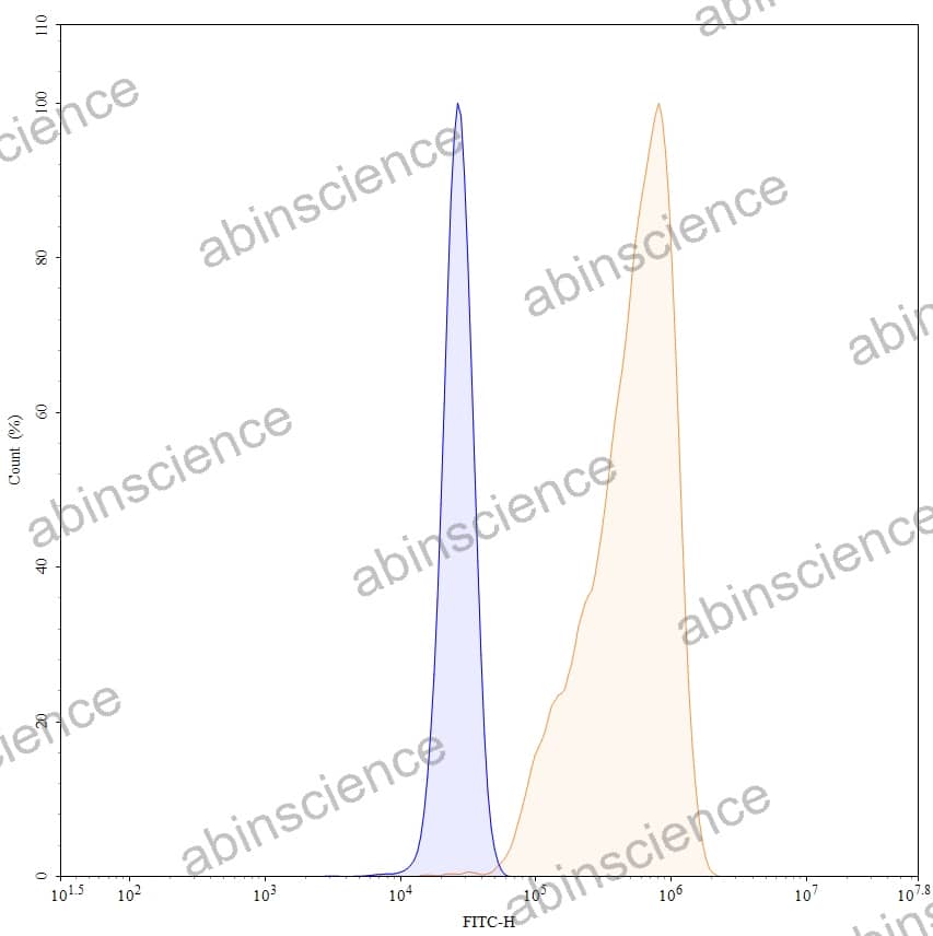 Flow-cytometry using FITC anti-human CTGF antibody. MG-63 cells were fixed and permeabilized, then stained with an irrelevant antibody (Blue Histogram) or an FITC anti-human CTGF monoclonal antibody (Catalog: HB719117, Yellow Histogram) at a concentration of 5 µg/ml for 30 mins at RT. After washing, cells analysed on a NovoCyte Flow Cytometer. |
