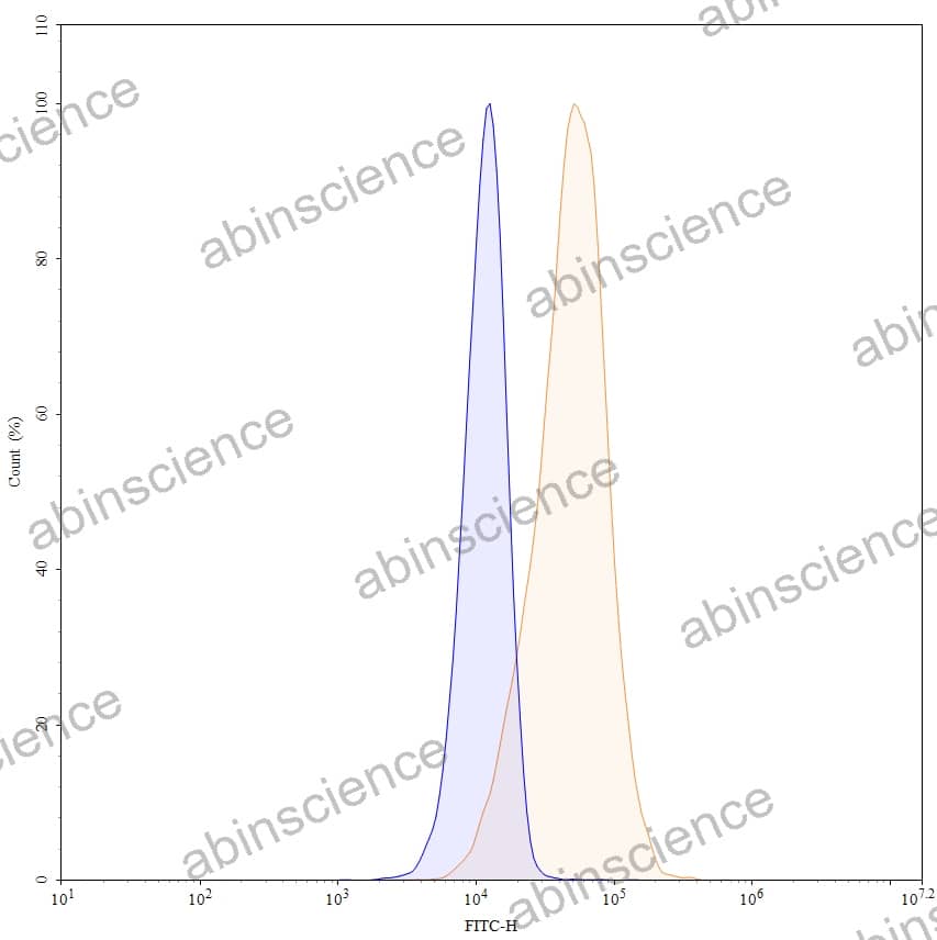 Flow-cytometry using FITC anti-human CD171 antibody. Hela cells were stained with an irrelevant antibody (Blue Histogram) or an FITC anti-human CD171 monoclonal antibody (Catalog: HB159117, Yellow Histogram) at a concentration of 5 µg/ml for 30 mins at RT. After washing, and cells analysed on a NovoCyte Flow Cytometer. |