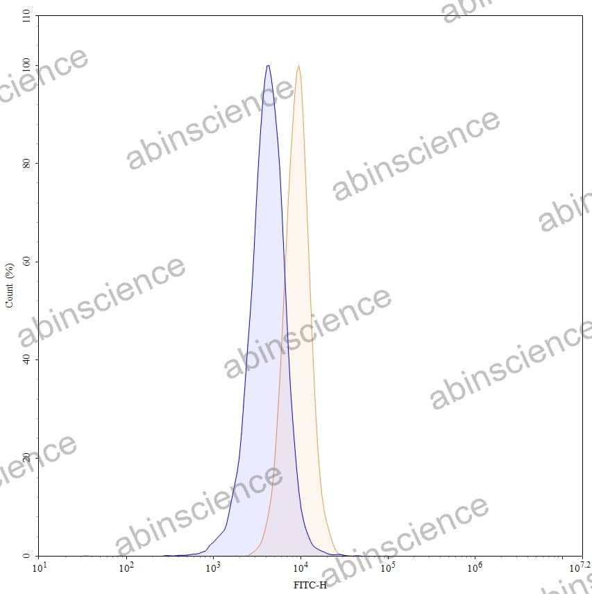Flow-cytometry using FITC anti-human ADCYAP1R1 antibody. SH-SY5Y cells were stained with an irrelevant antibody (Blue Histogram) or an APC anti-human ADCYAP1R1 monoclonal antibody (Catalog: HW609117, Yellow Histogram) at a concentration of 5 µg/ml for 30 mins at RT. After washing, and cells analysed on a NovoCyte Flow Cytometer. |