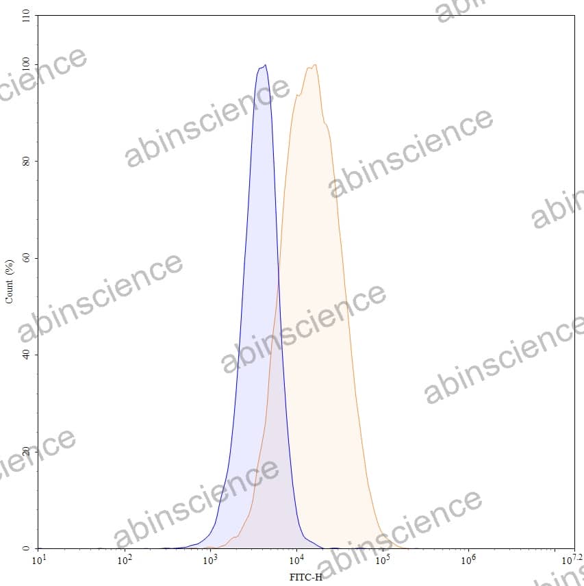 Flow-cytometry using FITC anti-human CD166 antibody. SH-SY5Y cells were stained with an irrelevant antibody (Blue Histogram) or an FITC anti-human CD166 monoclonal antibody (Catalog: HC678117, Yellow Histogram) at a concentration of 5 µg/ml for 30 mins at RT. After washing, and cells analysed on a NovoCyte Flow Cytometer. |