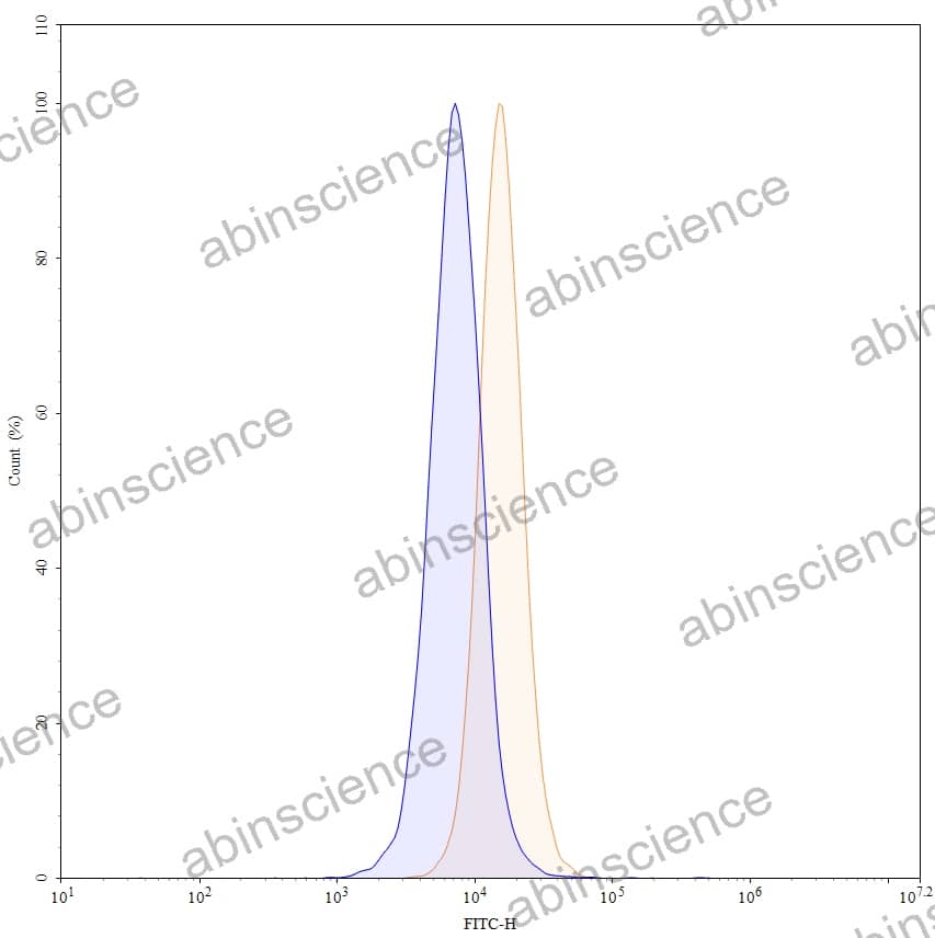 Flow-cytometry using FITC anti-human CD318 antibody. HT-29 cells were stained with an irrelevant antibody (Blue Histogram) or an FITC anti-human CD318 monoclonal antibody (Catalog: HV451117, Yellow Histogram) at a concentration of 5 µg/ml for 30 mins at RT. After washing, cells analysed on a NovoCyte Flow Cytometer. |