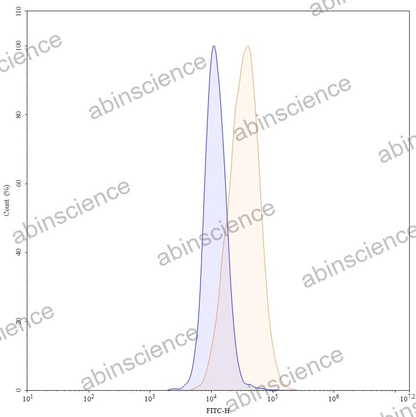 Flow-cytometry using FITC anti-human CD266 antibody. U251 cells were stained with an irrelevant antibody (Blue Histogram) or an FITC anti-human CD266 monoclonal antibody (Catalog: HV811117, Yellow Histogram) at a concentration of 5 µg/ml for 30 mins at RT. After washing, cells analysed on a NovoCyte Flow Cytometer. |