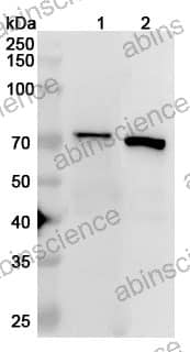 Western blot analysis was performed using anti-IGF2BP3 polyclonal antibody at 1ug/mL on various samples. Lane 1: NIH3T3 cell lysate Lane 2: K562 cell lysate