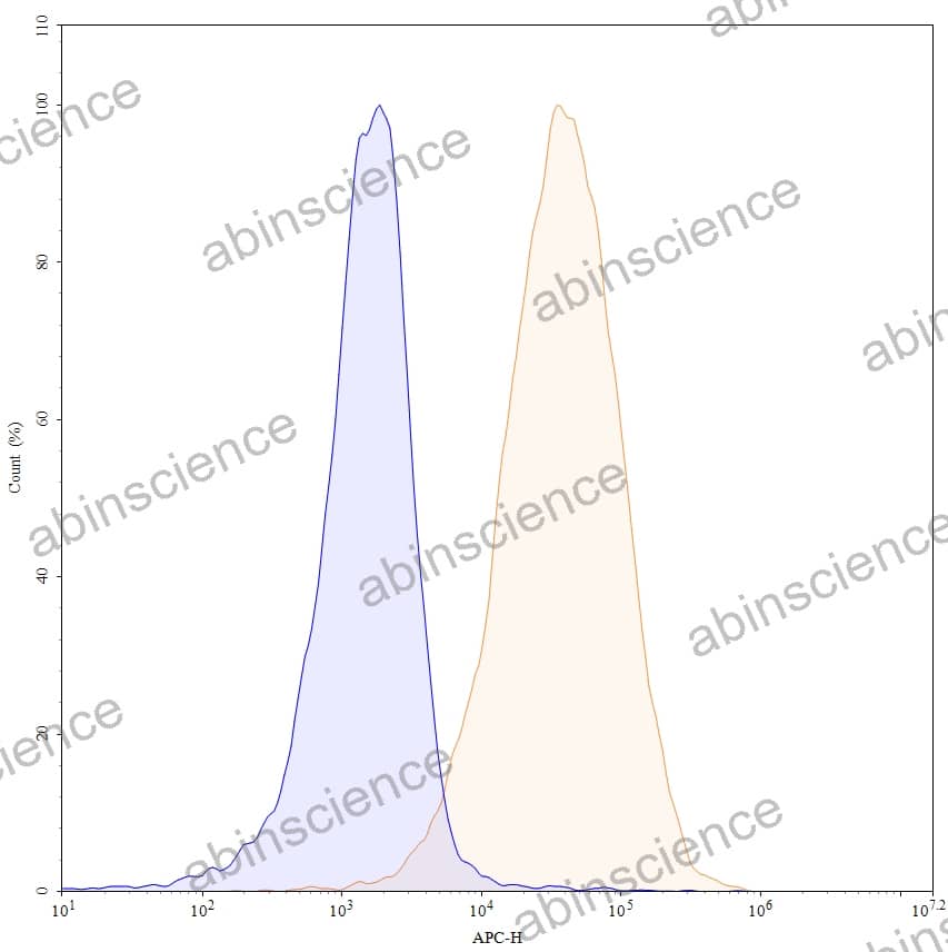 Flow-cytometry APC using anti-human CD335 antibody. Untransfected cells (blue Histogram) and Transfected cells (Yellow Histogram) were stained with an APC anti-human CD335 monoclonal antibody (Catalog: HF858137) at a concentration of 5 µg/ml for 30 mins at RT. After washing, cells analysed on a NovoCyte Flow Cytometer. |