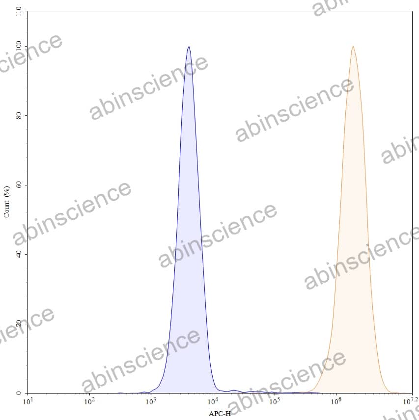 Flow-cytometry using APC anti-human EGFR antibody. A431 cells were stained with an irrelevant antibody (Blue Histogram) or an APC anti-human EGFR monoclonal antibody (Catalog: HF004237, Yellow Histogram) at a concentration of 5 µg/ml for 30 mins at RT. After washing, and cells analysed on a NovoCyte Flow Cytometer. |