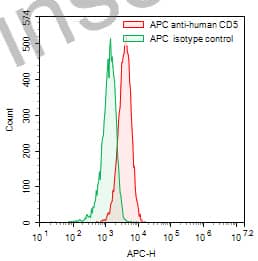 Flow-cytometry using APC anti-human CD5 antibody. Jurkat cells were stained with an irrelevant antibody (Green Histogram) or an APC anti-human CD5 antibody monoclonal antibody (Catalog # HY046137, Red Histogram) at a concentration of 5 µg/ml for 30 mins at RT. After washing, cells analysed on a NovoCyte Flow Cytometer. |