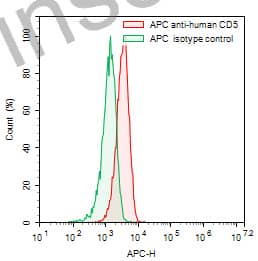 Flow-cytometry using APC anti-human CD5 antibody. Jurkat cells were stained with an irrelevant antibody (Green Histogram) or an APC anti-human CD5 antibody monoclonal antibody (Catalog # HY046237, Red Histogram) at a concentration of 5 µg/ml for 30 mins at RT. After washing, cells analysed on a NovoCyte Flow Cytometer. |