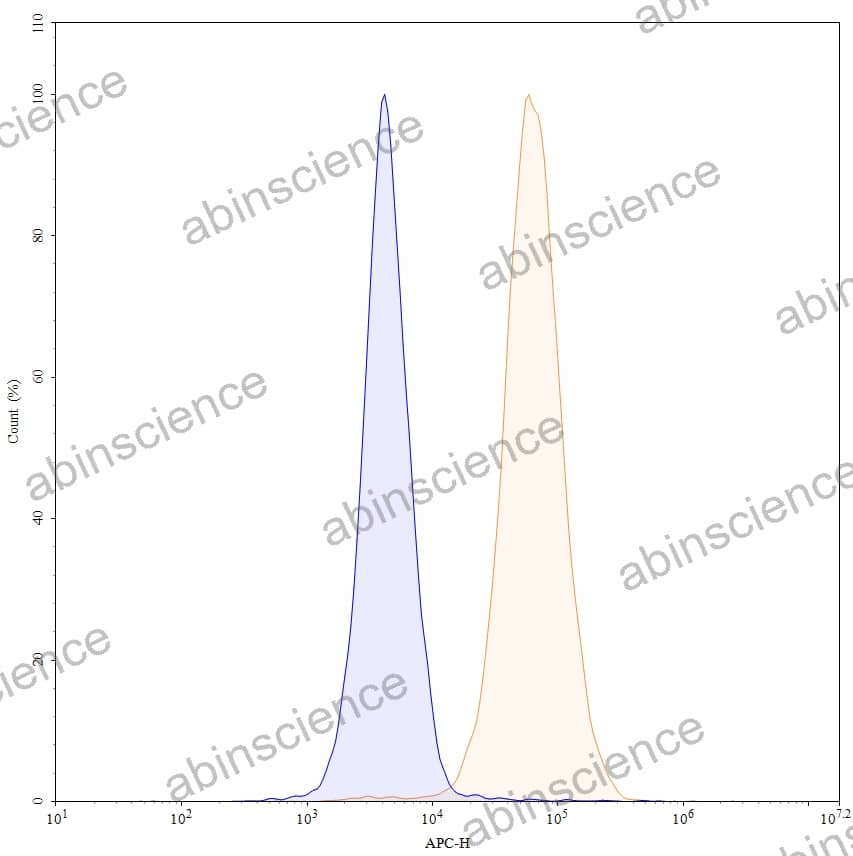 Flow-cytometry using APC anti-human CD51 antibody. HepG-2 cells were stained with an irrelevant antibody (Blue Histogram) or an APC anti-human CD51 monoclonal antibody (Catalog: HY065137, Yellow Histogram) at a concentration of 5 µg/ml for 30 mins at RT. After washing, cells analysed on a NovoCyte Flow Cytometer. |