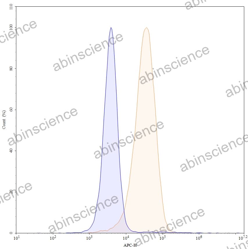 Flow-cytometry using APC anti-human CD7 antibody. Jurkat cells were stained with an irrelevant antibody (Blue Histogram) or an APC anti-human CD7 monoclonal antibody (Catalog: HY302137, Yellow Histogram) at a concentration of 5 µg/ml for 30 mins at RT. After washing, cells analysed on a NovoCyte Flow Cytometer. |