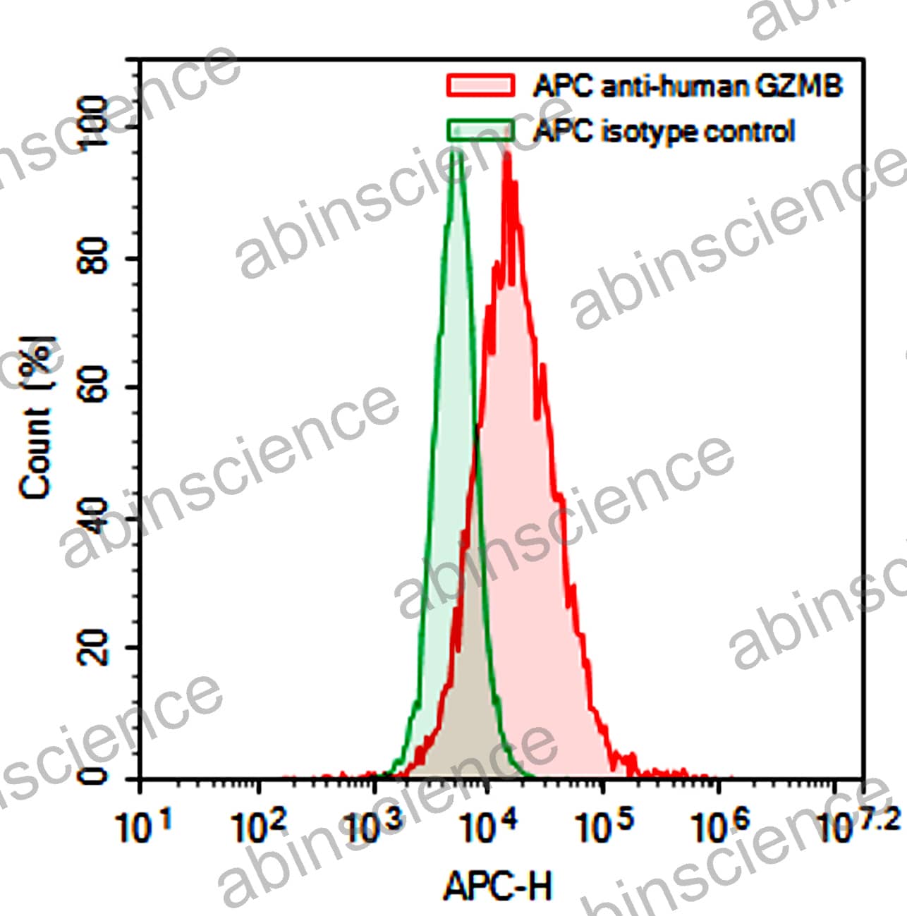 Flow-cytometry using APC anti-Human GZMB antibody. BXPC3 cells were stained with an irrelevant antibody (Green Histogram) or an APC anti-Human GZMB antibody monoclonal antibody (Catalog # HY574237 , Red Histogram) at a concentration of 5 µg/ml for 30 mins at RT. After washing, cells analysed on a NovoCyte Flow Cytometer. |