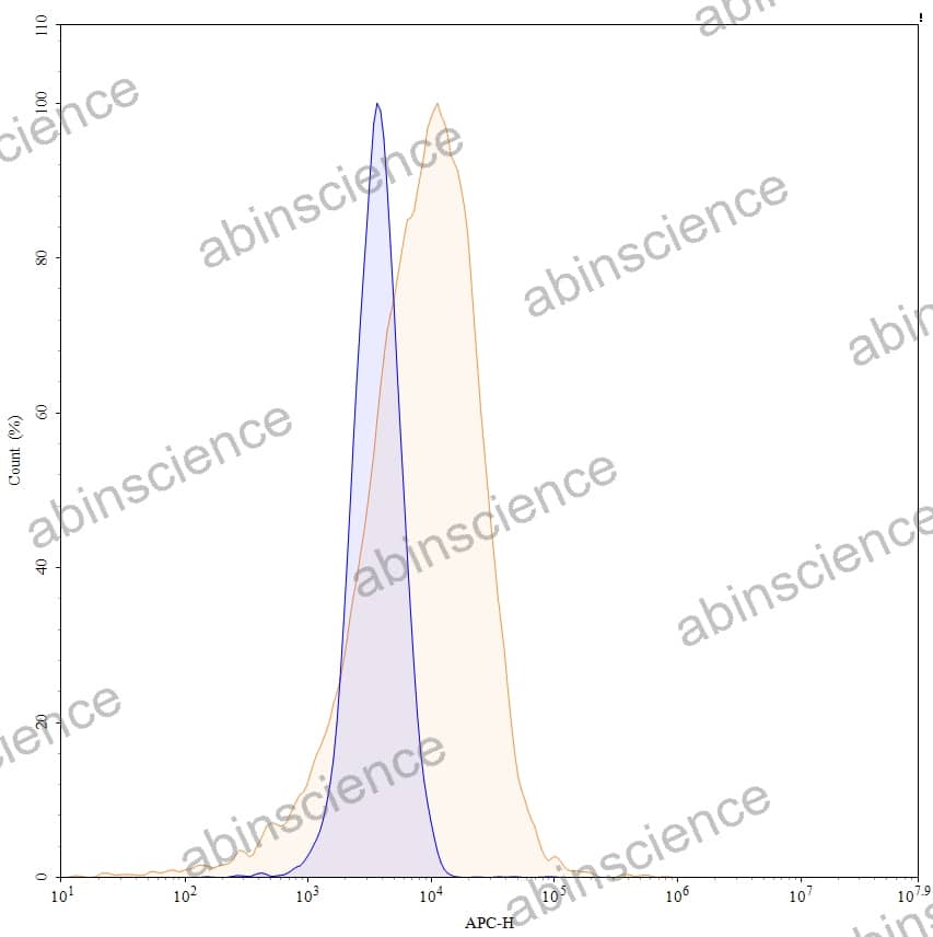 Flow-cytometry using APC anti-human MAPT antibody. HDLM-2 cells were stained with an irrelevant antibody (Blue Histogram) or an APC anti-human MAPT monoclonal antibody (Catalog: HY086137, Yellow Histogram) at a concentration of 5 µg/ml for 30 mins at RT. After washing, cells analysed on a NovoCyte Flow Cytometer. |