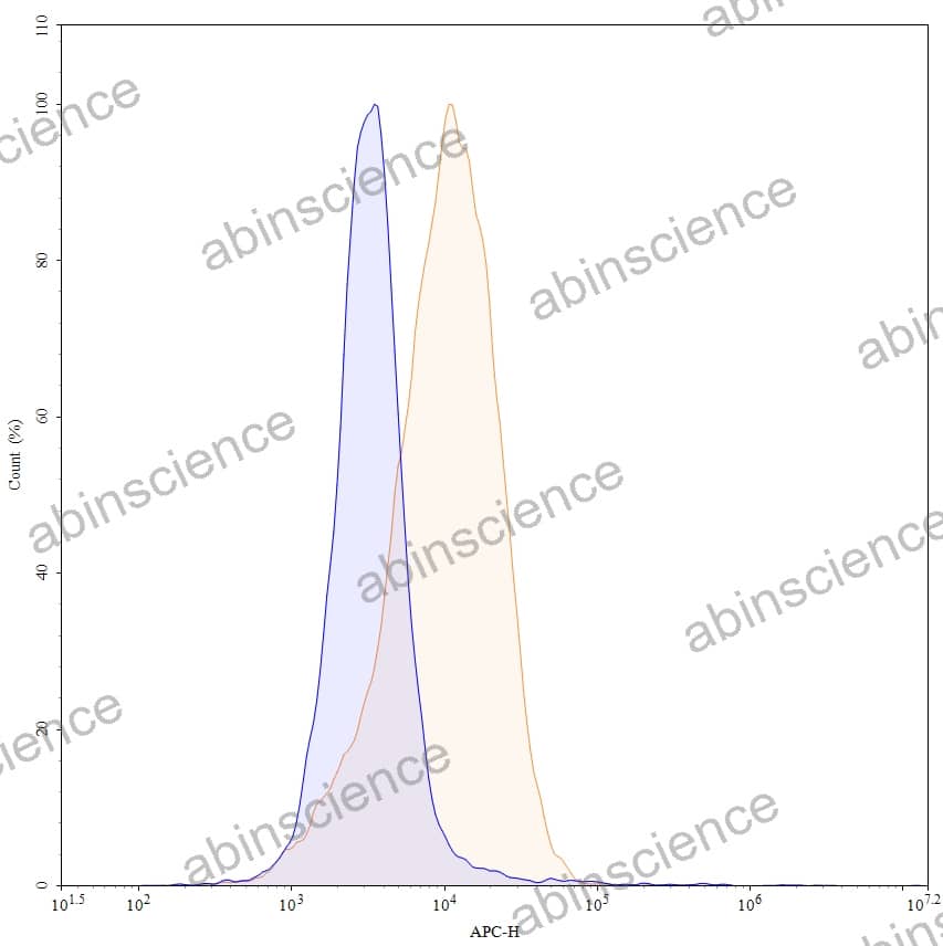 Flow-cytometry using APC anti-human CD117 antibody. HEL cells were stained with an irrelevant antibody (Blue Histogram) or an APC anti-human CD116 monoclonal antibody (Catalog: HY163137, Yellow Histogram) at a concentration of 5 µg/ml for 30 mins at RT. After washing, and cells analysed on a NovoCyte Flow Cytometer. |
