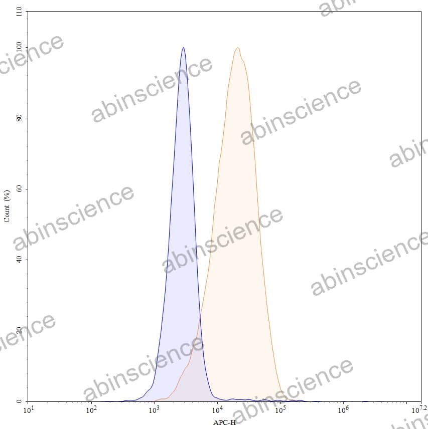 Flow-cytometry using APC anti-human CD37 antibody. Raji cells were stained with an irrelevant antibody (Blue Histogram) or an APC anti-human CD37 monoclonal antibody (Catalog: HY564137, Yellow Histogram) at a concentration of 5 µg/ml for 30 mins at RT. After washing, cells analysed on a NovoCyte Flow Cytometer. |