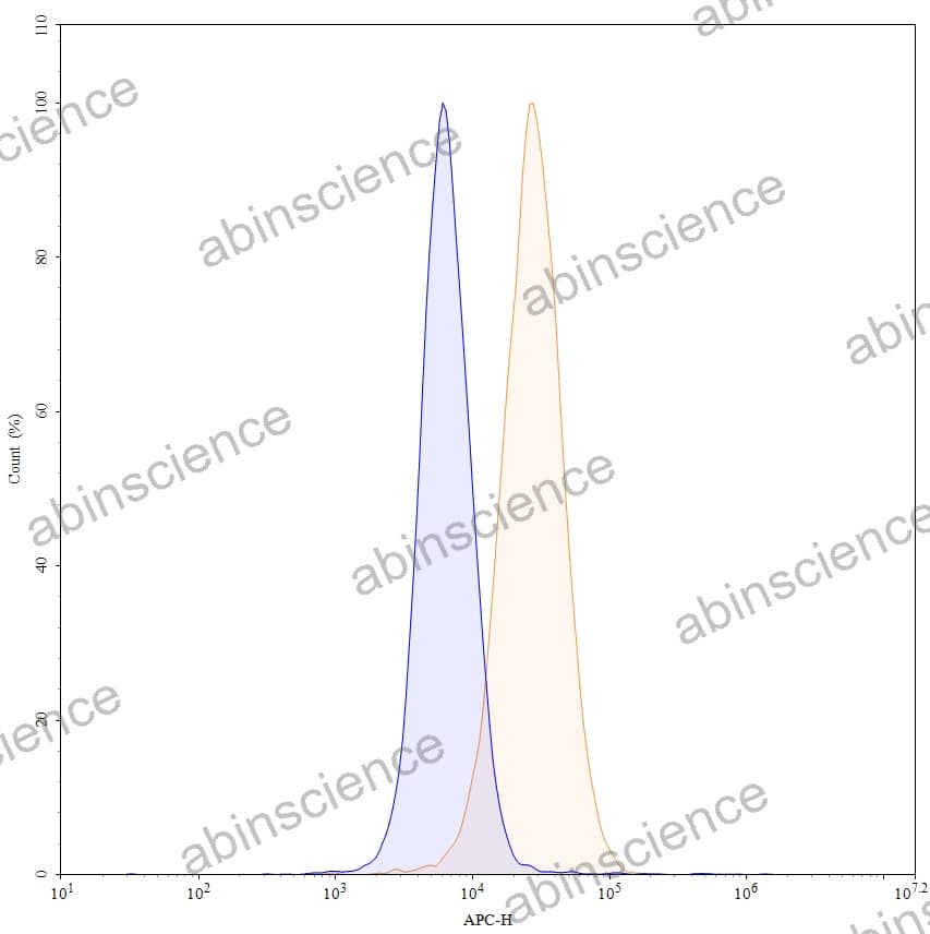 Flow-cytometry using APC anti-human CD222 antibody. HepG-2 cells were fixed and permeabilized, then stained with an irrelevant antibody (Blue Histogram) or an APC anti-human CD222 monoclonal antibody (Catalog: HY282137, Yellow Histogram) at a concentration of 5 µg/ml for 30 mins at RT. After washing, cells analysed on a NovoCyte Flow Cytometer. |