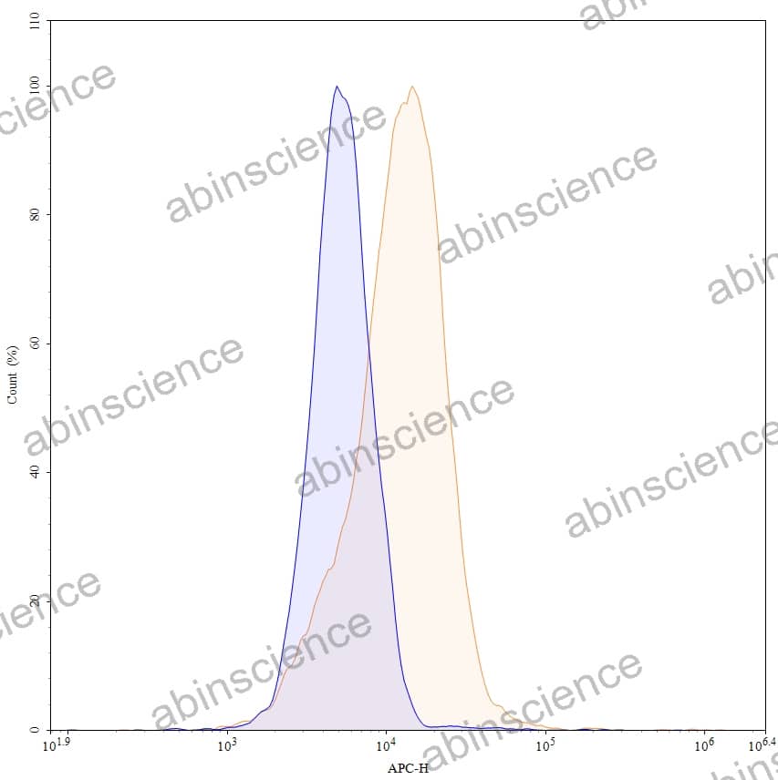 Flow-cytometry using APC anti-human CD324 antibody. HT-29 cells were stained with an irrelevant antibody (Blue Histogram) or an APC anti-human CD324 monoclonal antibody (Catalog: HY460137, Yellow Histogram) at a concentration of 5 µg/ml for 30 mins at RT. After washing, cells analysed on a NovoCyte Flow Cytometer. |