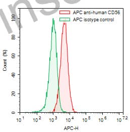 Flow-cytometry using APC anti-human CD56 antibody. SH-SY5Y cells were stained with an irrelevant antibody (Green Histogram) or an APC anti-human CD56 antibody monoclonal antibody (Catalog # HY309137, Red Histogram) at a concentration of 5 µg/ml for 30 mins at RT. After washing, cells analysed on a NovoCyte Flow Cytometer. |