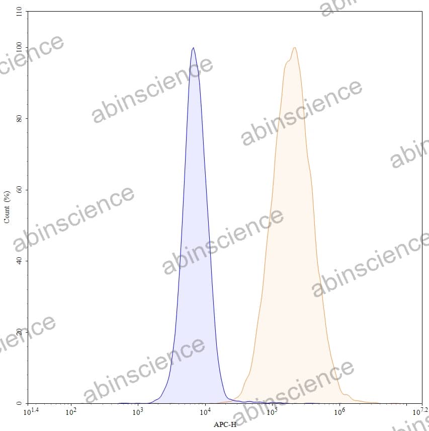 Flow-cytometry using APC anti-human CD66a antibody. HT-29 cells were stained with an irrelevant antibody (Blue Histogram) or an APC anti-human CD66a monoclonal antibody (Catalog: HB880137, Yellow Histogram) at a concentration of 5 µg/ml for 30 mins at RT. After washing, cells analysed on a NovoCyte Flow Cytometer. |