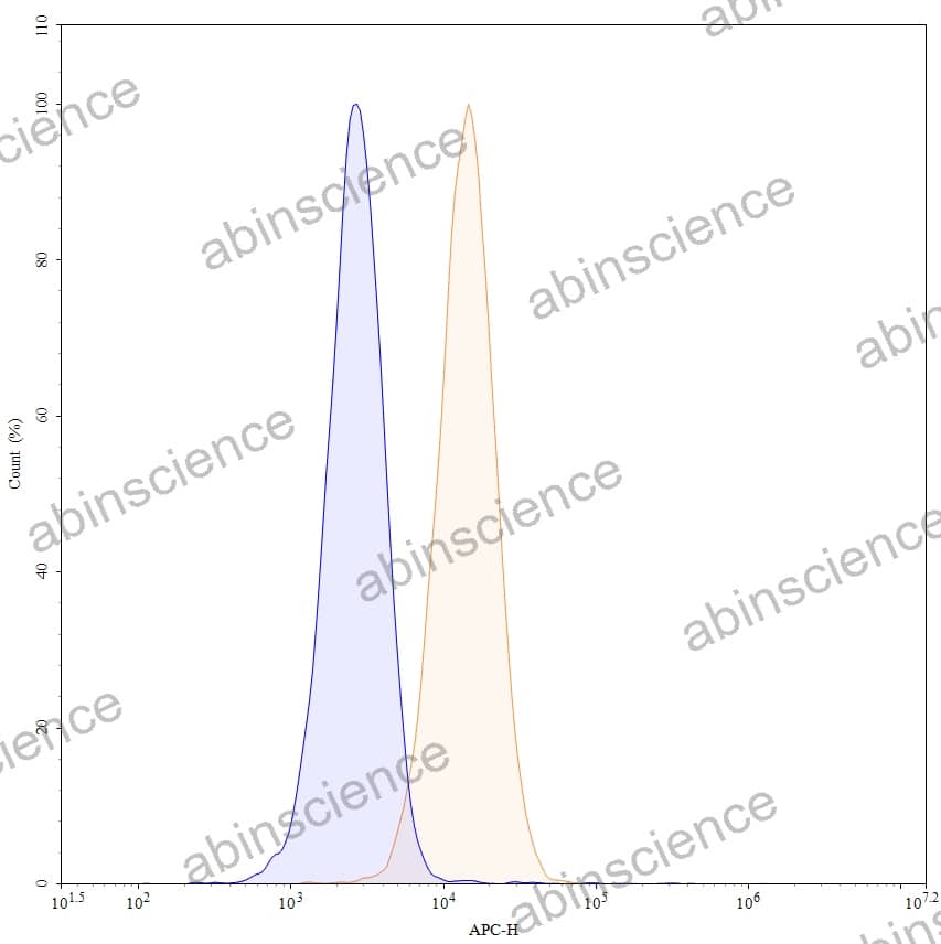 Flow-cytometry using APC anti-human CD13 antibody. U937 cells were stained with an irrelevant antibody (Blue Histogram) or an APC anti-human CD13 monoclonal antibody (Catalog: HB650237, Yellow Histogram) at a concentration of 5 µg/ml for 30 mins at RT. After washing, and cells analysed on a NovoCyte Flow Cytometer. |