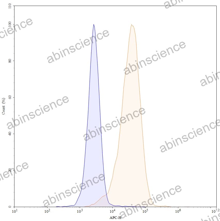 Flow-cytometry using APC anti-human FOLR1 antibody. Hela cells were stained with an irrelevant antibody (Blue Histogram) or an APC anti-human FOLR1 monoclonal antibody (Catalog: HB825137, Yellow Histogram) at a concentration of 5 µg/ml for 30 mins at RT. After washing, and cells analysed on a NovoCyte Flow Cytometer. |