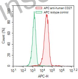 Flow-cytometry using APC anti-human CD27 antibody. Raji cells were stained with an irrelevant antibody (Green Histogram) or an APC anti-human CD27 antibody monoclonal antibody (Catalog # HB796237, Red Histogram) at a concentration of 5 µg/ml for 30 mins at RT. After washing, cells analysed on a NovoCyte Flow Cytometer. |