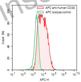 Flow-cytometry using APC anti-human CD38 antibody. RPMI-8226 cells were stained with an irrelevant antibody (Green Histogram) or an APC anti-human CD38 antibody monoclonal antibody (Catalog # HB691237, Red Histogram) at a concentration of 5 µg/ml for 30 mins at RT. After washing, cells analysed on a NovoCyte Flow Cytometer. |